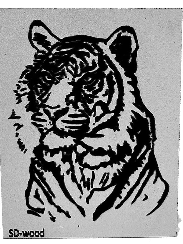Τι τεχνική χρησιμοποιείται για το σχέδιο της τίγρης στην ξύλινη πινακίδα;